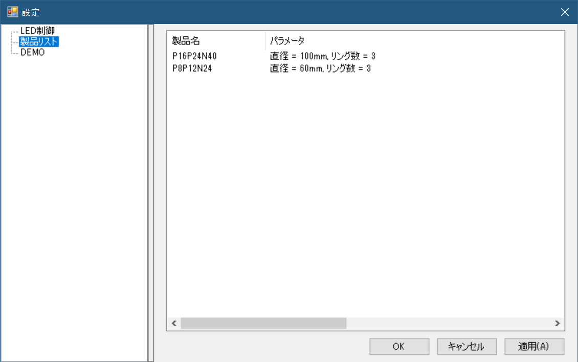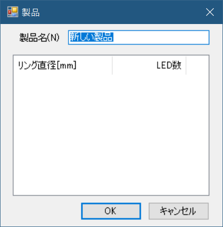 製品テンプレートは、円形上に配置された LED の個数と、配置する円(リング)の直径を指定します。配置する円は複数登録することができます。製品リスト上で、右クリックをするとコンテキストメニューが表示されます。コンテキストメニューの 追加 をクリックすると、テンプレート編集ダイアログが表示されます。