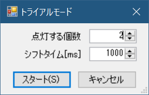 トライアルモードは、照明の点灯位置を指定した個数ずつ、指定した時間毎に自動的に、または手動で順次切り替えながら照明効果を確認する機能です。トライアルモードを実行するには、制御 > トライアルモード をクリックします。トライアルモードの設定ダイアログが表示されます。