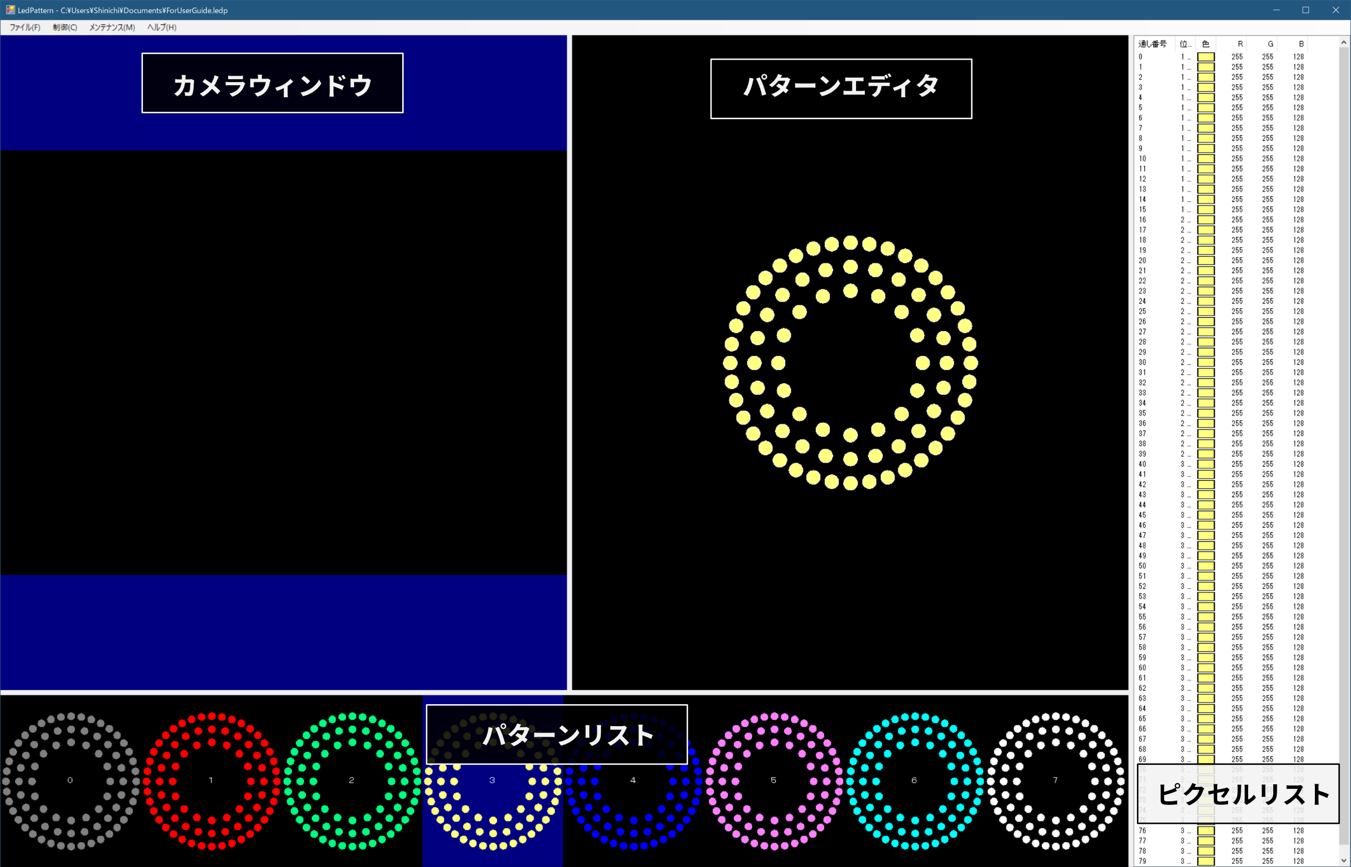 LedPattern アプリケーションは、照明装置の LED の個数、配置を視覚的に表示し、LED 一つ一つの色、明るさを設定する Windows 用アプリケーションです。また、照明条件の検証を行いやすくするための、 トライアルモードを備えています。